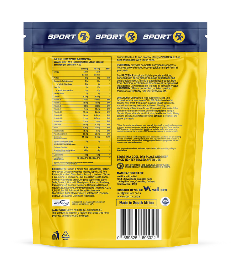 Our meal replacement shake is high in protein and fibre, enriched with performance-focused superfoods and deliciously smooth. This is a clean-label product, free from chemical, artificial and biochemically engineered ingredients. Consumed post-training or between meals, PROTEIN Rx offers a convenient, nutrient-packed formula to effectively fuel your everyday life.